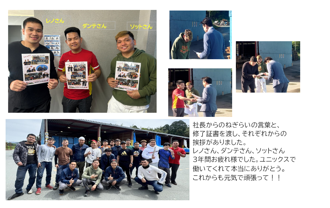 先月に引き続き、今月も3名の実習生が帰国することになりました😢